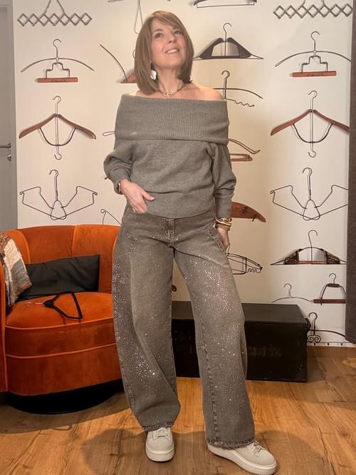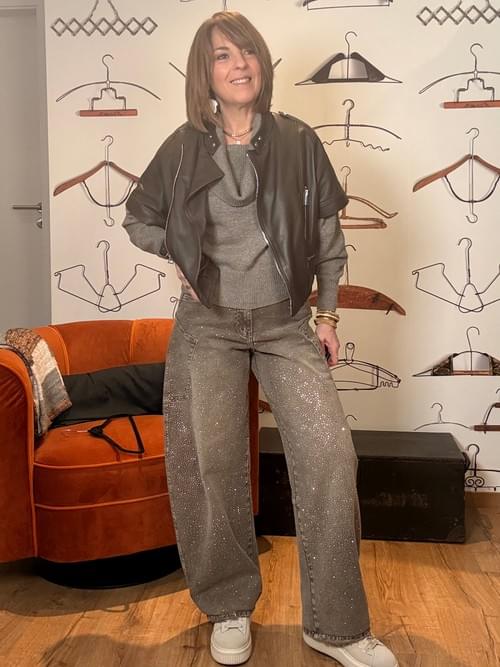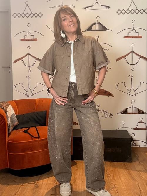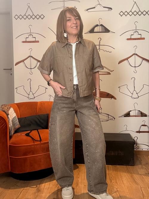 Jeans Barrel taupe avec brillants